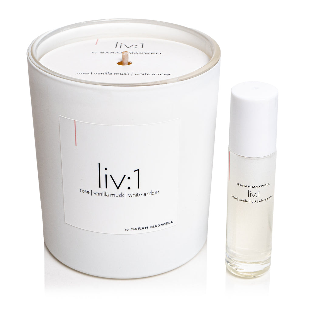 This pairing consists of a perfumed oil and candle featuring one of Sarah's best selling scents, liv:1, a blend with notes of rose, vanilla musk, and white amber. Striking yet understated, this clean, classic, warm scent can be found in boutiques from New York to Dubai. Named after her daughter Olivia, liv:1 is the first offering of her decades-long, worldwide journey to develop the most rare and finest scents available.
